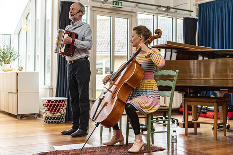 Anders Ahnfelt-Rønne er skuespiller og pianist - og optrådte også i sin ungdom på plejehjem og 'alderdomshjem'i en lille trup fra Fiolteatret sammen med blandt andre Jesper Christensen. - Kirstine Elise Pedersen er cellist, uddannet ved Hochschule für Musik und Theater Rostock og Carl Nielsen Academy of Music.